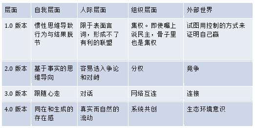 Otto Scharmer认为,人的思维模式的不同,会导致人在面对自己、他人、所处的组织和外部世界这四个不同层面时的观念和行为不同,导致结果的不同。他把思维模式界定为从1.0版本到4.0版本。思维版本越高,获得的结果就越好。因此,要推动事情向更好的结果发展,首先要解决人的思维版本的升级换代。